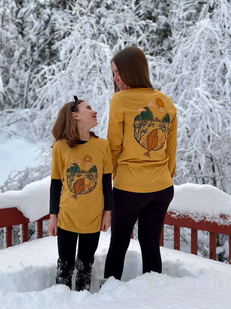 Spending a day fishing in Alaska is a memory that can last a lifetime! When you drop a line in the water you never know what will be on the other end, as Halibut range from 10 lbs to over 400! This design depicts a small fishing boat on the front left chest, and on the back is a full Alaskan scene with a large halibut caught on the line!